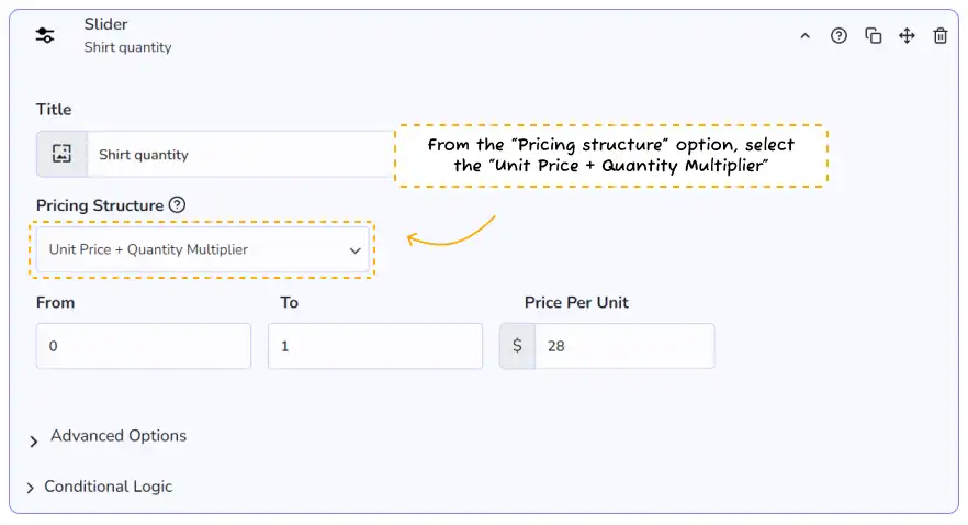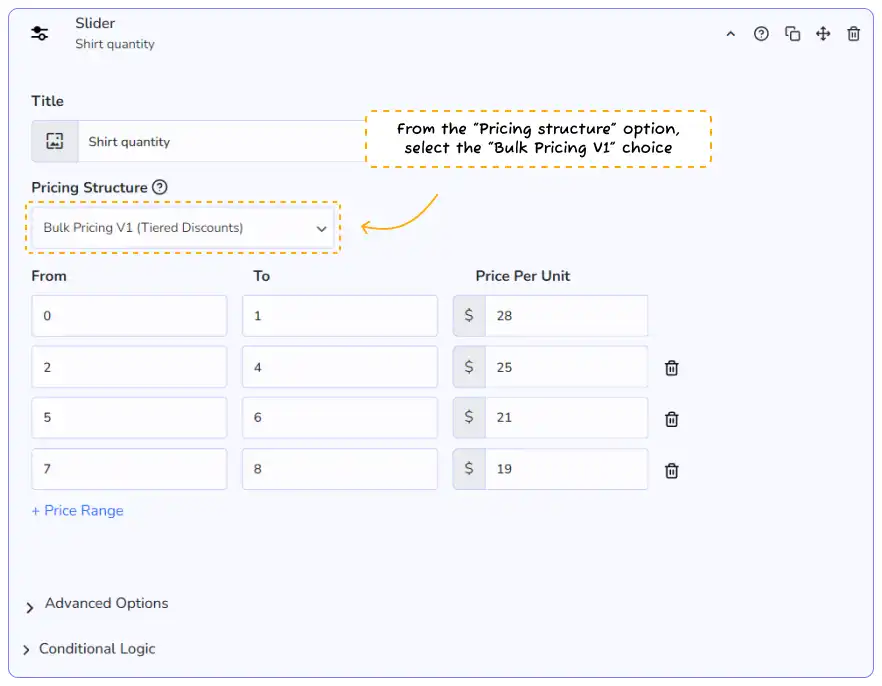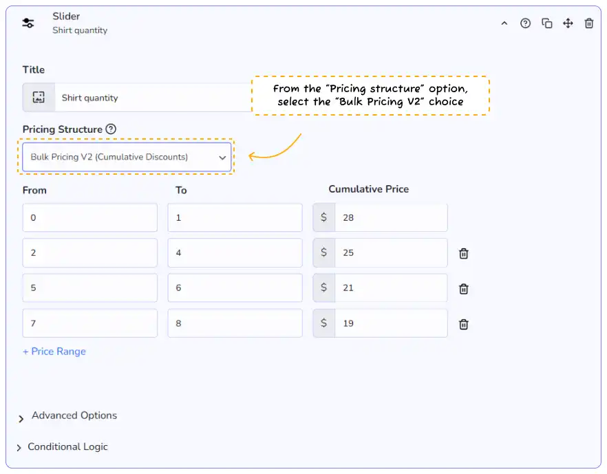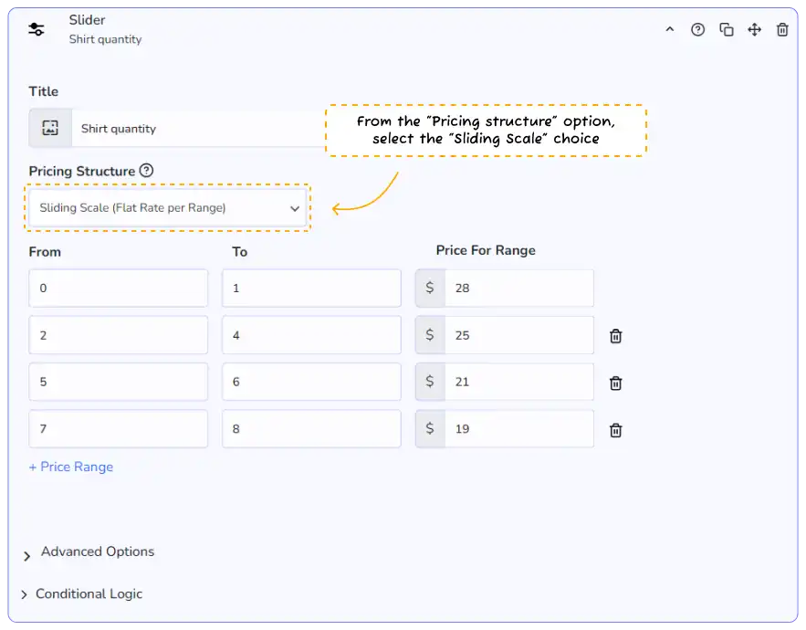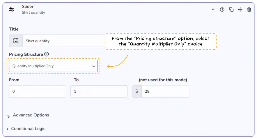 👉 Note: all pricing modes act as a quantity modifier. If you don’t want this, place your slider in its own subsection.