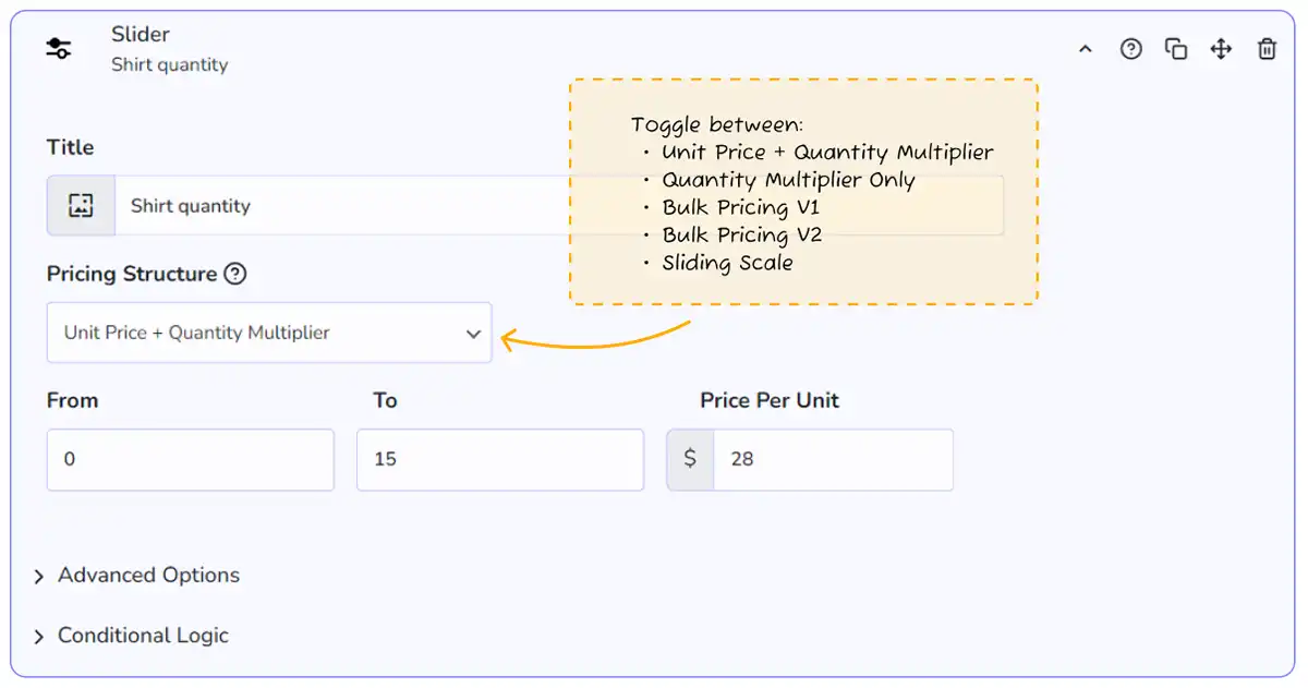 The Slider element has four different modes for pricing structure: Unit Price + Quantity Multiplier, Quantity Multiplier Only, Bulk Pricing V1 (Tiered Discounts), Bulk Pricing V2 (Cumulative Discounts) and Sliding Scale (Flat Rate per Range). This guide provides examples of how each mode can be implemented to effectively adjust pricing strategies based on quantity or scale, catering to different sales and marketing needs.